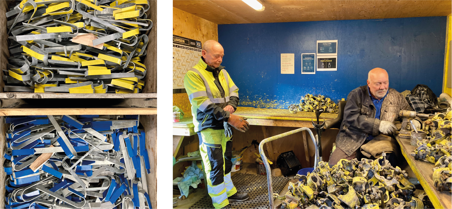 Stilladser består af en række komponenter, som løbende skal tjekkes og vedligeholdes for at opretholde sikkerheden for dem, der skal arbejde på stilladserne. Preben (tv.) og Lasse (th.) sørger blandt andet for, at koblinger til stilladserne bliver renset og smurt, så de fungerer optimalt.