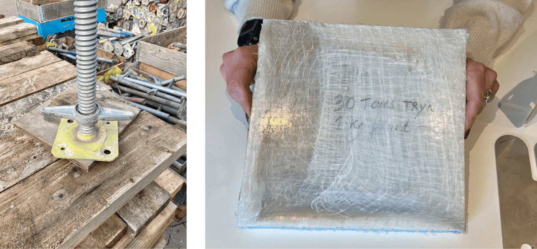 Sammen med undervisere og studerende fra DTU har Sara Lorentzen testet, om stilladsplasten kan smeltes om til en plade, der kan erstatte træstykkerne under stilladsfødderne. Plastpladen består af et kilo plast, som kan holde til et tryk på 30 tons.