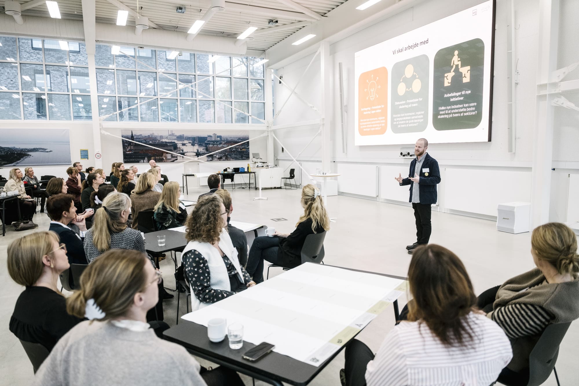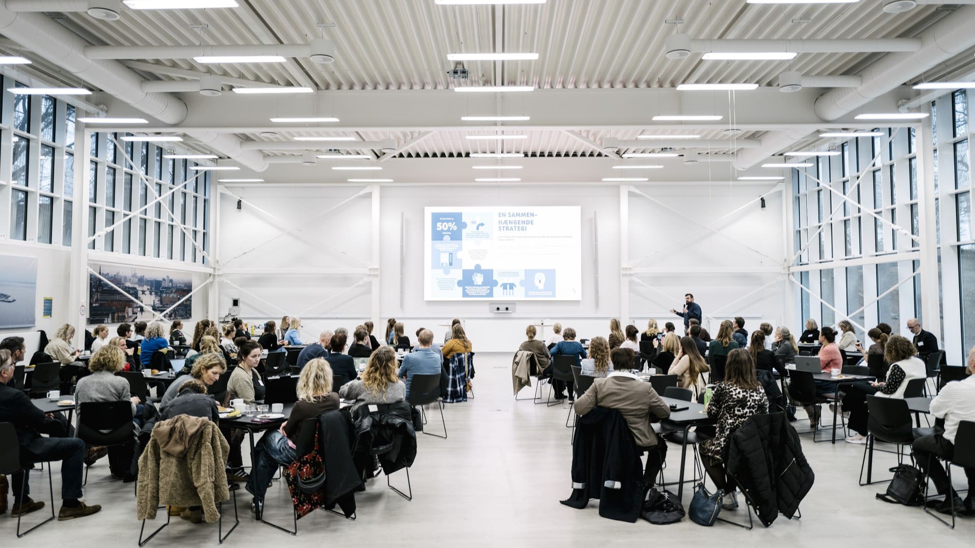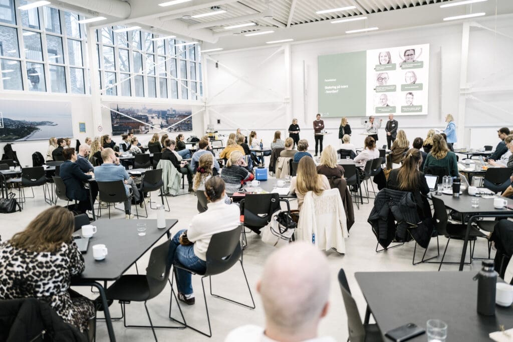 Over 100 mennesker var samlet hos Gate 21 i Albertslund til konferencen. For med sundhedsreformen skal sundhedssektoren omstilles, så langt mere pleje og behandling foregår tæt på borgerne. Flere ældre med komplekse pleje- og behandlingsbehov kræver et styrket samarbejde mellem regioner og kommuner. Men samtidig står både regioner og kommuner over for en anden fælles udfordring: Hvordan sikrer man udvikling af en bæredygtig og mere cirkulær sundhedssektor? Og hvordan sikrer vi, at de gode løsninger bliver delt på tværs af hospitaler, plejehjem, hjemmepleje og almen praksis?
