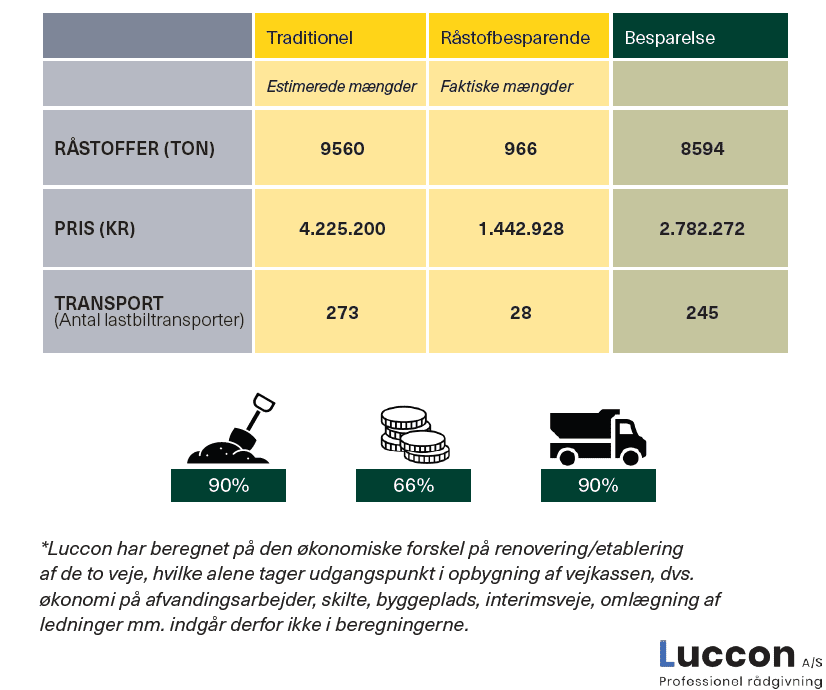 De faktiske mængder i det råstofbesparende projekt er sammenstillet med estimerede mængder, hvis man havde anvendt traditionelle metoder.