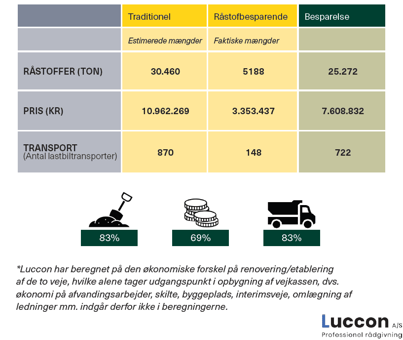 De faktiske mængder i det råstofbesparende projekt er sammenstillet med estimerede mængder, hvis man havde anvendt traditionelle metoder.